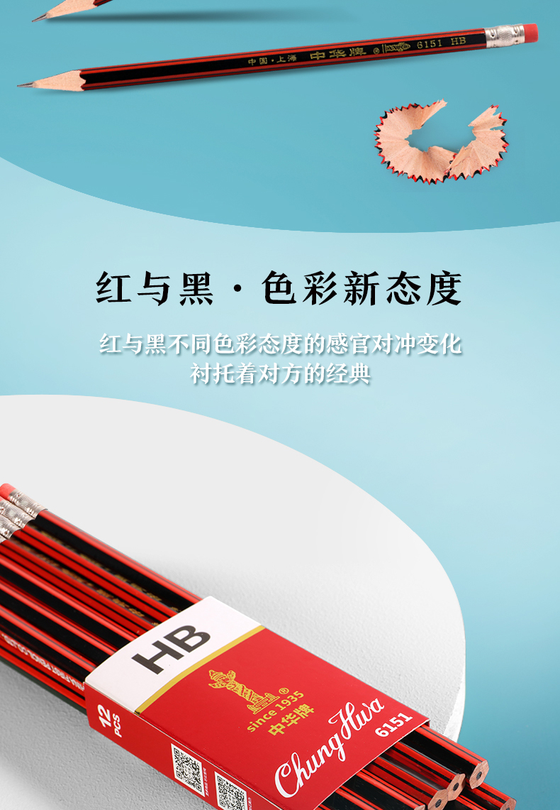 首页 > 购物专区 > 文化用品 > 中华 经典红黑抽条学生办公书写HB铅笔六角 48支/盒 6151 HB
