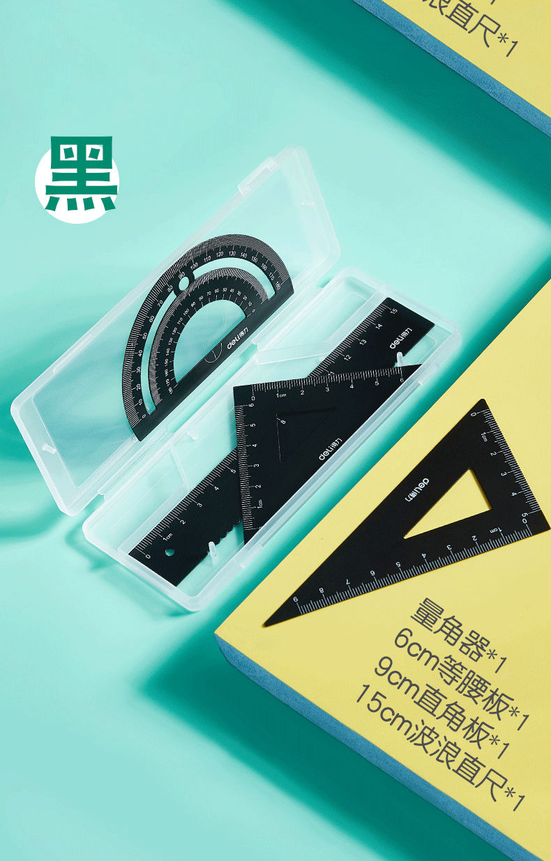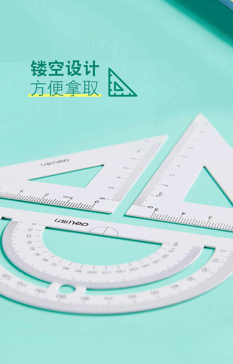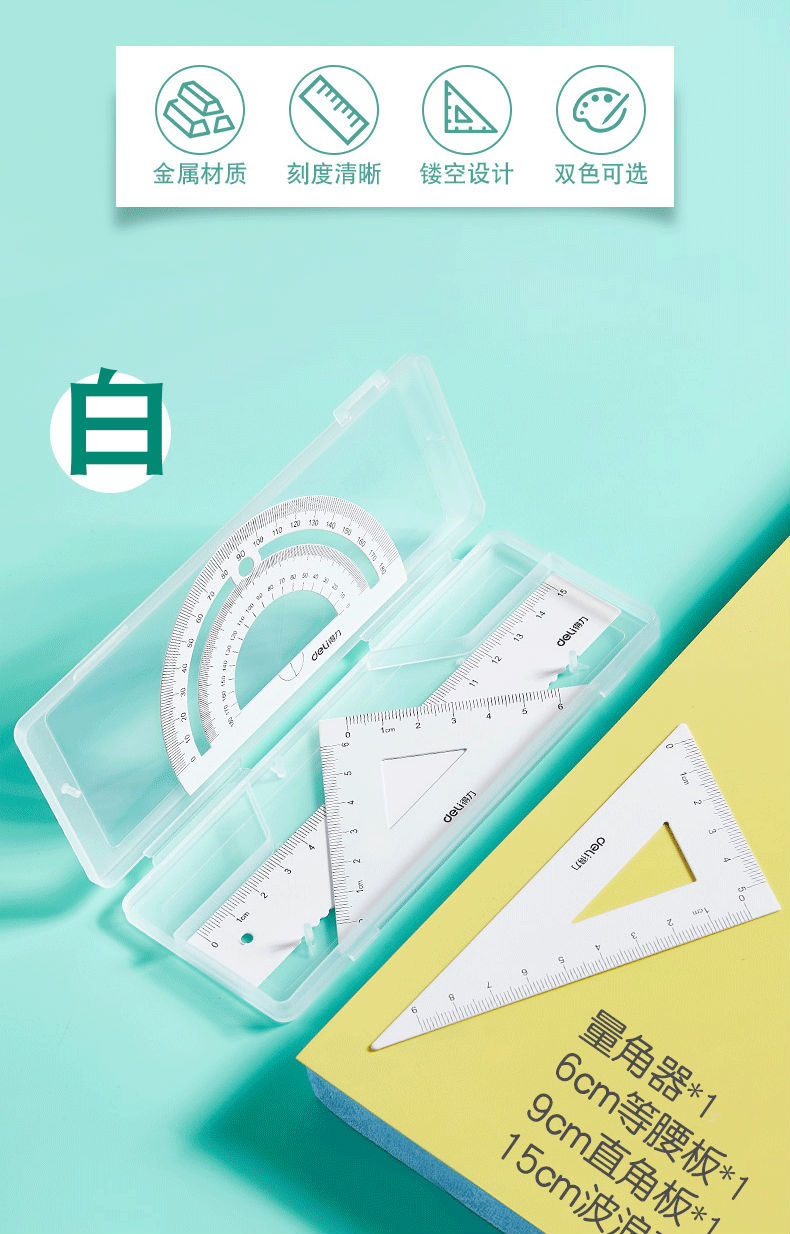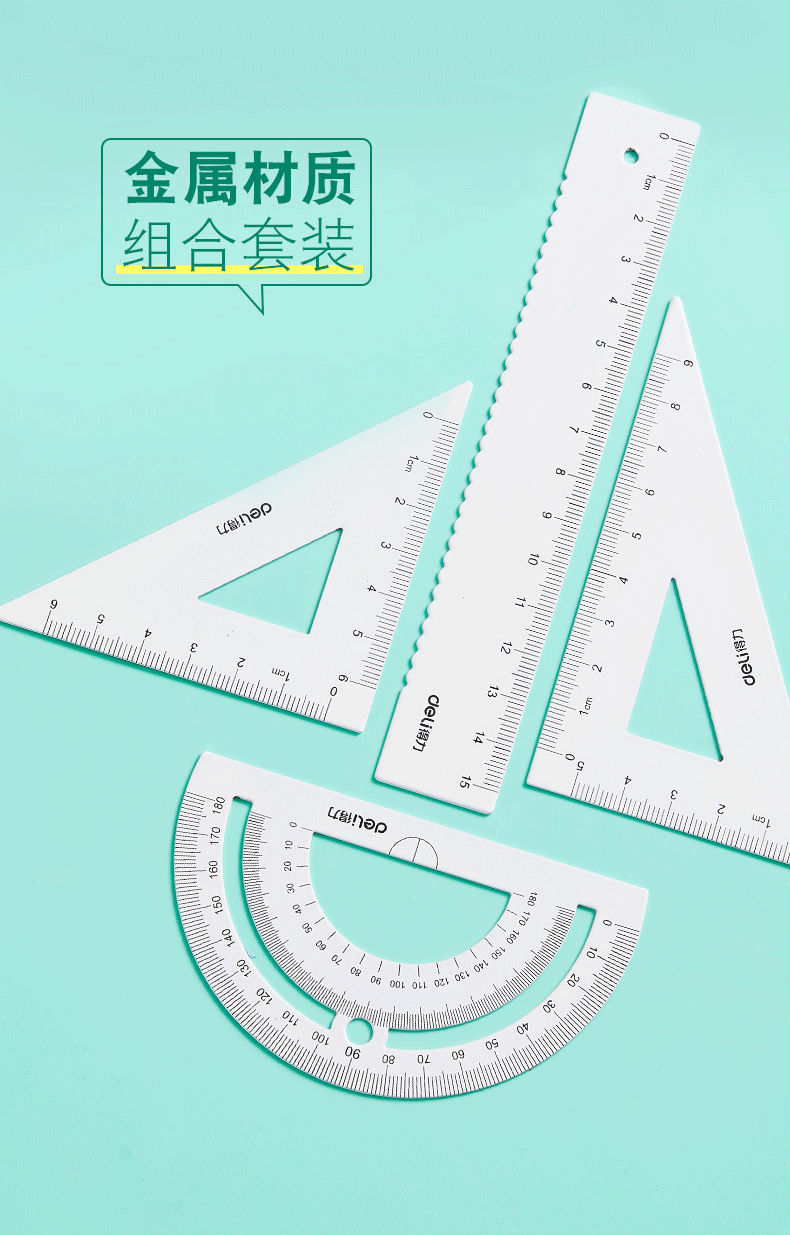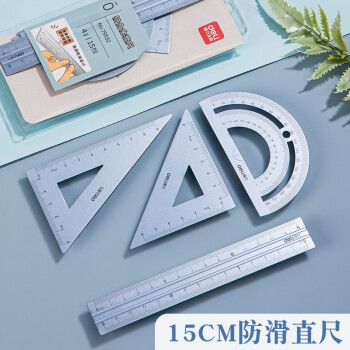 商品名称:得力金属尺套装三角套尺学生用尺子套装三角板量角器刻度直尺铁尺子文具测量尺子学生文具金属多功能简约格尺 79532/蓝色金属套尺/附收纳袋